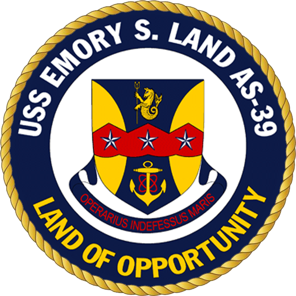 USS EMORY S. LAND’s crest was designed with the assistance of the U.S. Army Department of Heraldry. The field of the shield, with its blue and yellow background, suggests a chasm with a red bar serving as the bridge. The upper edge of the bar represents mountain peaks and the lower edge represents flowing water.